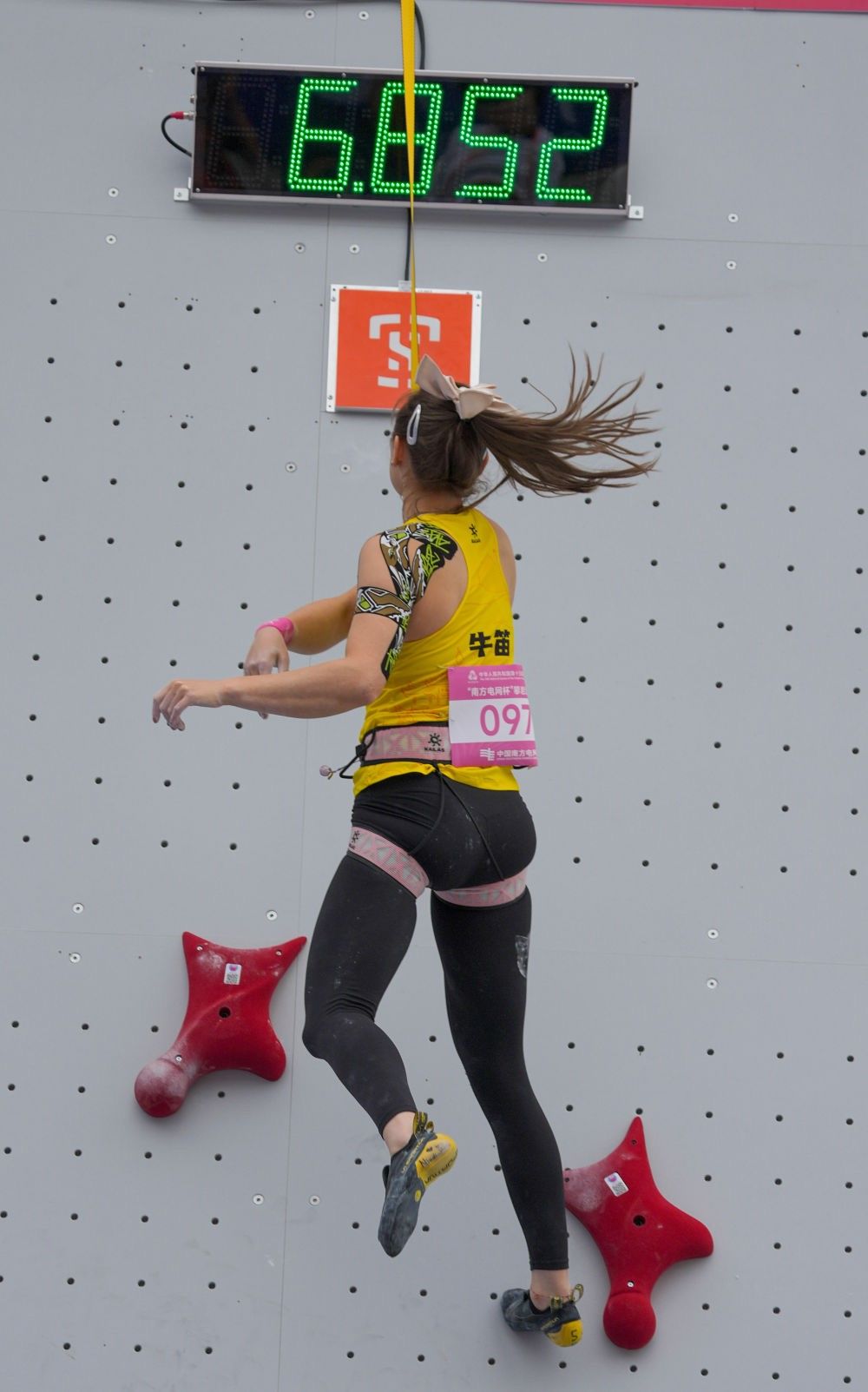 在女子速度攀岩决赛中,我校校友、29岁的卫冕冠军牛笛代表湖北队出战,在八进四的比赛中对阵浙江队周娅菲,最终更年轻的周娅菲胜出,牛笛上方的计时器打出:6秒54,最终牛笛获得第五名。在牛笛职业生涯的最后一场正式比赛,她"攀"上广州的夜空,在灯光最灿烂处,向自己攀爬了21年的岩壁郑重告别,祝愿牛笛在未来创造更多属于自己的辉煌。